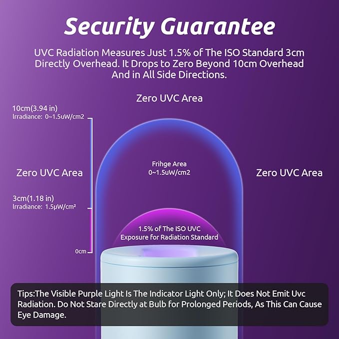 - Quad-Shield Defense: Locks UVC Leaks Via 0.8w Micro-Led, Directional Beams, Anti-Reflective Walls & Deep-Well Containment. Meets Just 1.5% of ISO Radiation Limits at 3cm — Zero Exposure Beyond 10cm.