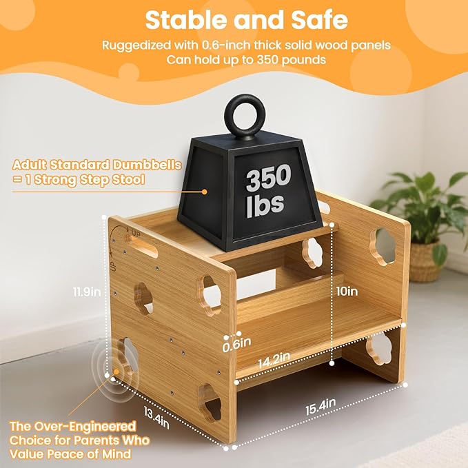 - Dual-Height Design for Growing Kids:This toddler step stool flips effortlessly to switch between two heights, adapting to your child’s needs from 18 months to 5+ years. Made from solid eco-friendly pine wood, it supports up to 350 lbs, ensuring stability for climbing, washing hands, or potty training. The wooden step stool grows with your child, promoting independence at every stage.