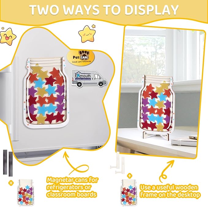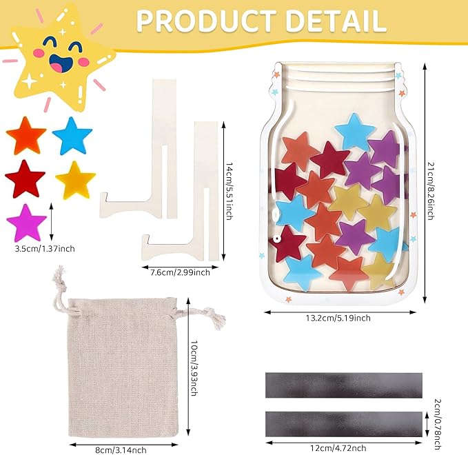 - Stars Reward Jar: Package includes 1 x stars reward jar, 5 x 5 pcs stars, 1 x jar stand, and 2 x magnet