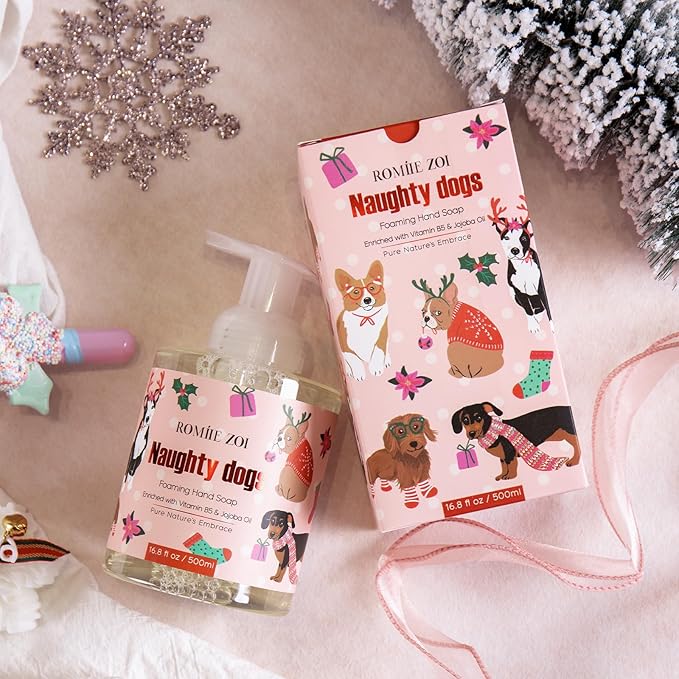 ROMIIE ZOI Christmas Foaming Hand Soap with Gift Box- Naughty Dogs Design, Winter Candy Apple Scented - Holiday Bathroom Soap for Winter Home Decoration and Gifting – 500ml / 16.8oz