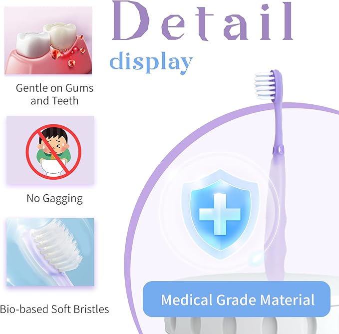 - EFFICIENT BABY ORAL CLEANER: Training toothbrush is sized just right for kids’ mouths and small fingers to help baby build the skills they need to reach independent brushing. extra-soft bristles helps simultaneously clean and massage baby's gums and teeth, promoting oral health and hygiene.
