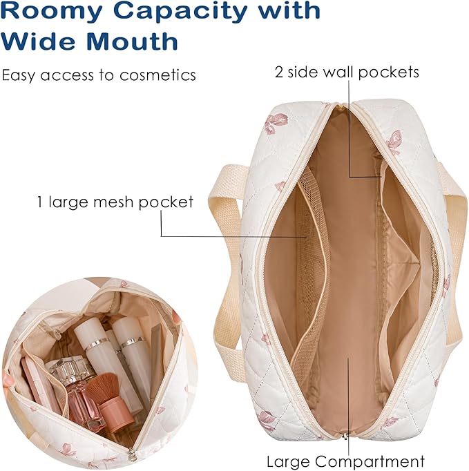 - [Fashionable Design]: This cute quilted bag features an exquisite pattern and crafted from premium cotton fabric, it is lined with premium nylon fabric, ensuring a comfortable touch, soft and skin-friendly. The handle design of this bag makes it effortless to carry, perfect for slipping into your handbag, luggage, or carrying it with you wherever you go, allowing for quick touch-ups and makeup application on the move.