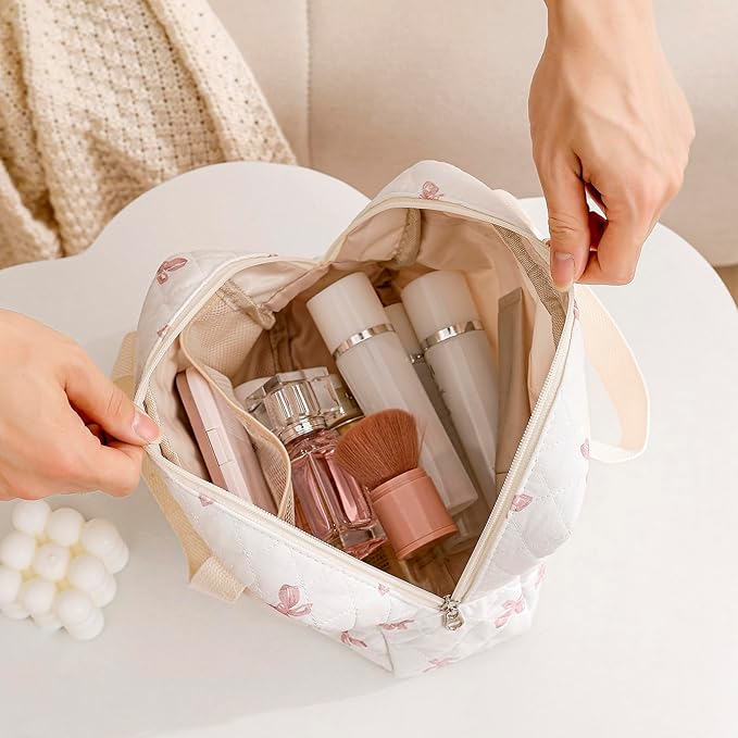 Large Size Quilted Coquette Makeup Bag, Cute Preppy Floral Cotton Travel Cosmetic Organizer Bag with Top Handle, Multi-Layer Travel Toiletry Pouch for Girls (08Heart Bow)
