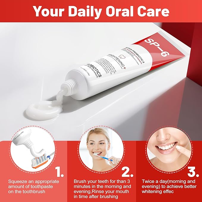 - 【Brighten Your Smile】- Formulated with 6 types of probiotics , effectively removes residues from coffee, tea. Etc., dissolve tooth surface stains, while rebuilding gum defenses. Brushing your teeth with our SP-6 whitening toothpaste, breathe fresh, blooms your smile brightly and confidently.
