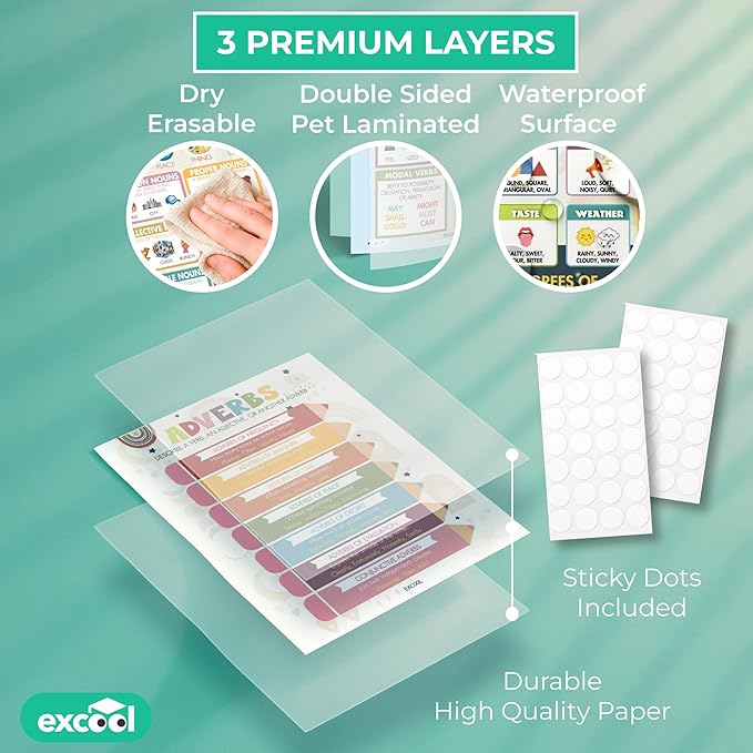 EXCOOL CLUB 9 Parts Of Speech Posters For Classroom Decor - Boho English Grammar Posters For Elementary, Laminated Ela Poster For Middle School Classroom Must Haves, Language Arts Teacher Supplies