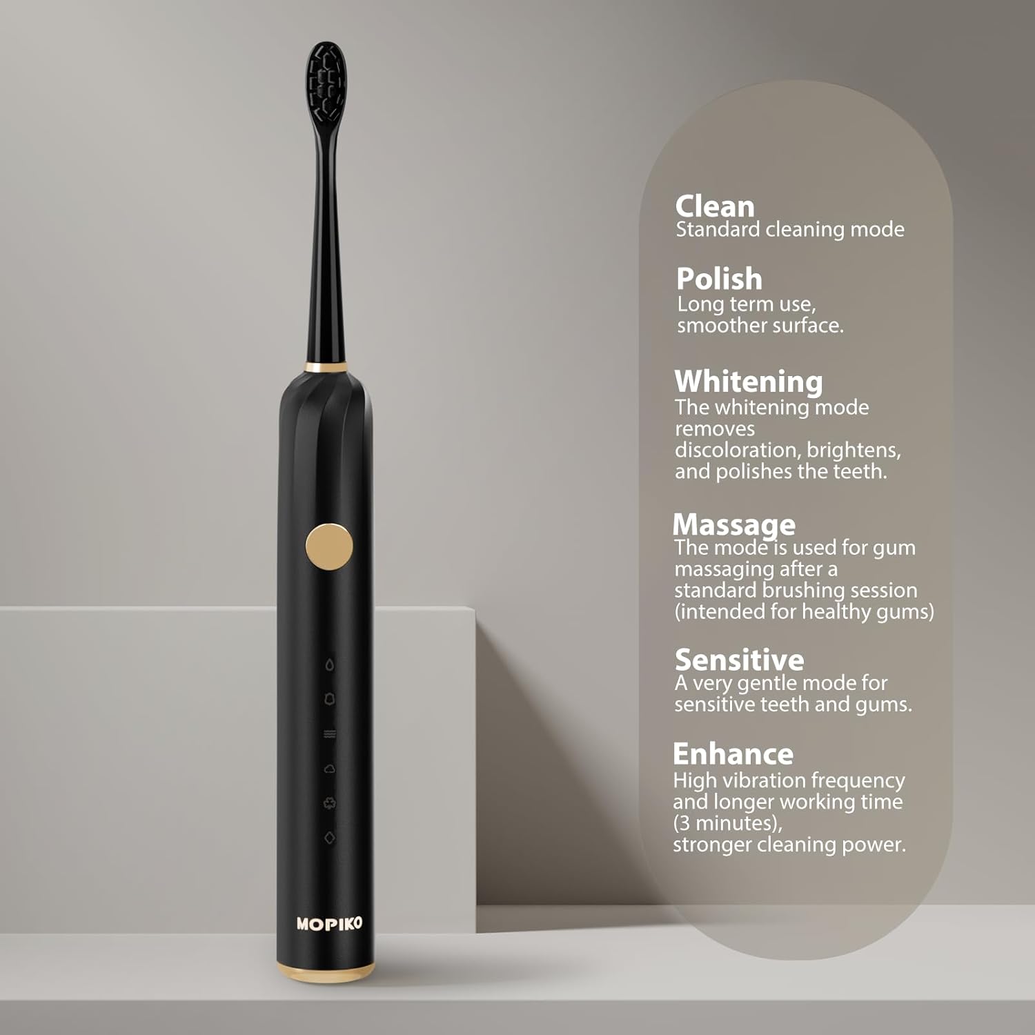 - SMART MODES: Clean (Daily Cleaning), Polish (Surface Stain Removal), Brightening (Stain Reduction), Massage (Gum Stimulation), Sensitive (Gentle Cleaning), Enhance (3-Minute Deep Clean). Covering various needs.