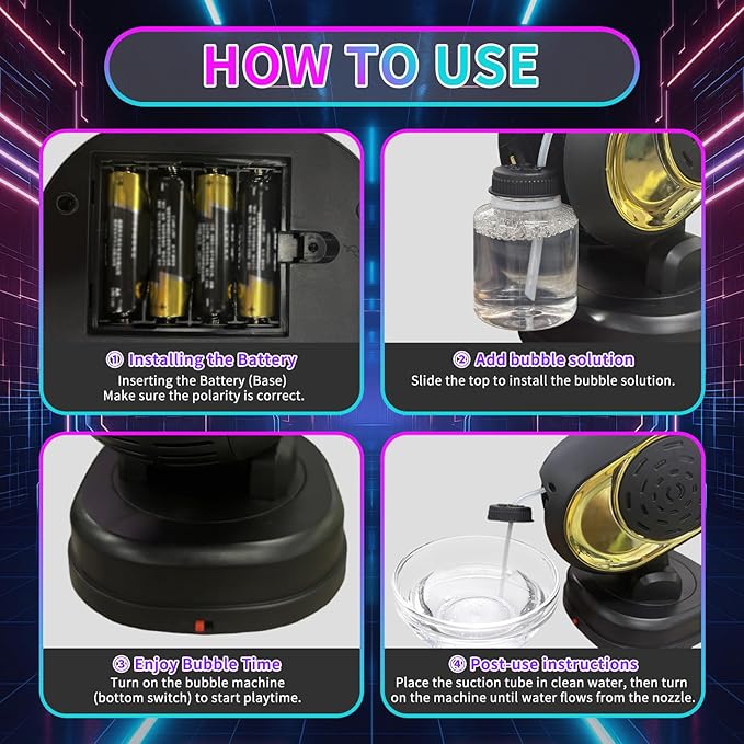 - 【Bubble Blower-Battery-Powered for Convenience】: This battery-operated bubble machine runs on 4 1.5V "AA" size batteries, providing a experience without the need for frequent recharging. Whether you're at a wedding or celebrating a birthday, the portable bubble machine ensures you can keep the fun going without interruption.