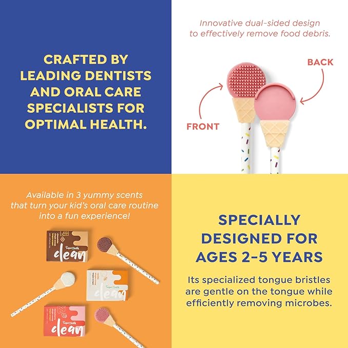 - Toothbrushes Don’t Clean Tongues! Toddlers need specialized care—our patented, dual-sided Single Scoop Tongue Scraper features soft tongue bristles on one side to comfortably clean deep crevices, and a scraper side to remove odor-causing buildup, debris, and fight bad breath. Perfect for sensitive mouths, early oral care habits, and daily freshness.