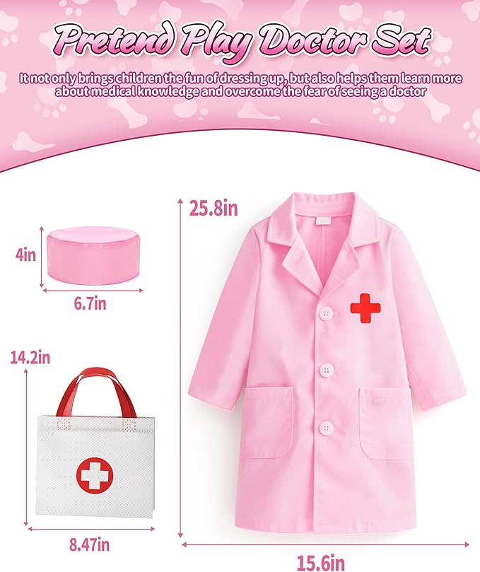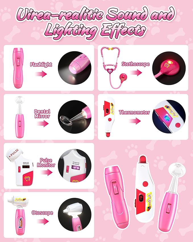 - 【36PCS Pet Veterinary Set】Our doctor kit includes a doctor's coat, storage bag, surgical light, blood pressure cuff, and more to recreate medical environments. The fun stethoscope simulates heartbeat sounds, LED light, and thermometer enhance imaginative play and help familiarize kids with common medical tools and routines.