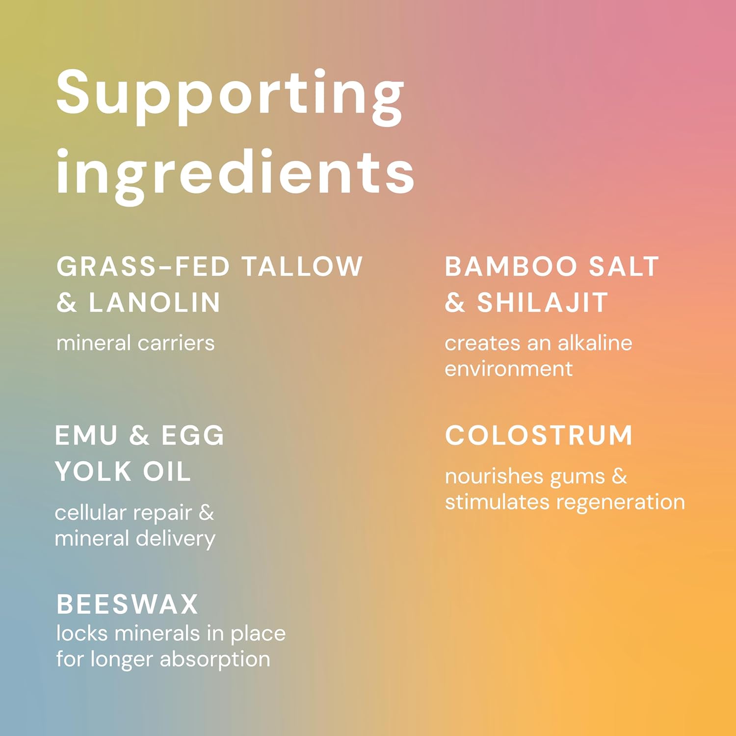 - NATURAL AND ANIMAL BASED INGREDIENTS - Beef tallow, lanolin, emu oil, and egg yolk oil ensure calcium and phosphorous are delivered into the enamel. We use a significant amount of the highly bioavailable bovine hydroxyapatite (from grass fed New Zealand cattle). The formula also utilizes bamboo salt, calcium carbonate, colostrum, pearl powder, oyster shell, and shilajit to create a formula that is rich in bioavailable minerals and highly alkalinizing