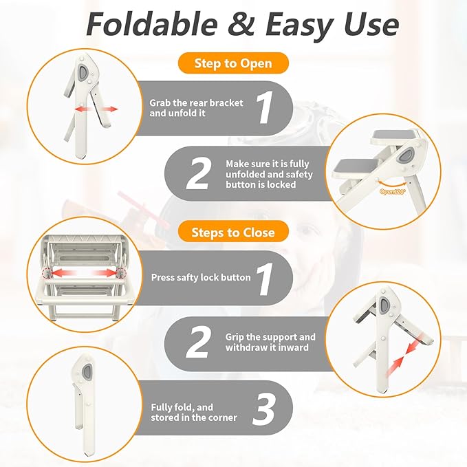- Safety Tips: For better and safer use, please unfold the step stool to the maximum angle to ensure the safety button is locked ensure stability. For easier storage, just press the safety button and fold. Please avoid folding forcibly to extend service life
