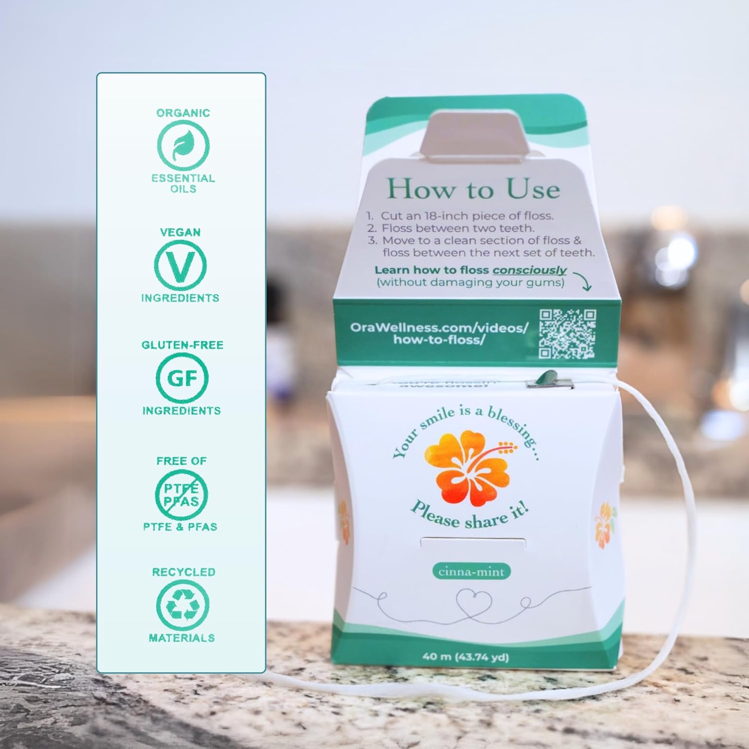 - NATURAL ESSENTIAL OILS of peppermint, cinnamon, and clove soothe the mouth. OraWellness floss is gluten free, vegan, PFAS free, PTFE free, eco friendly, and safe for everyday use.