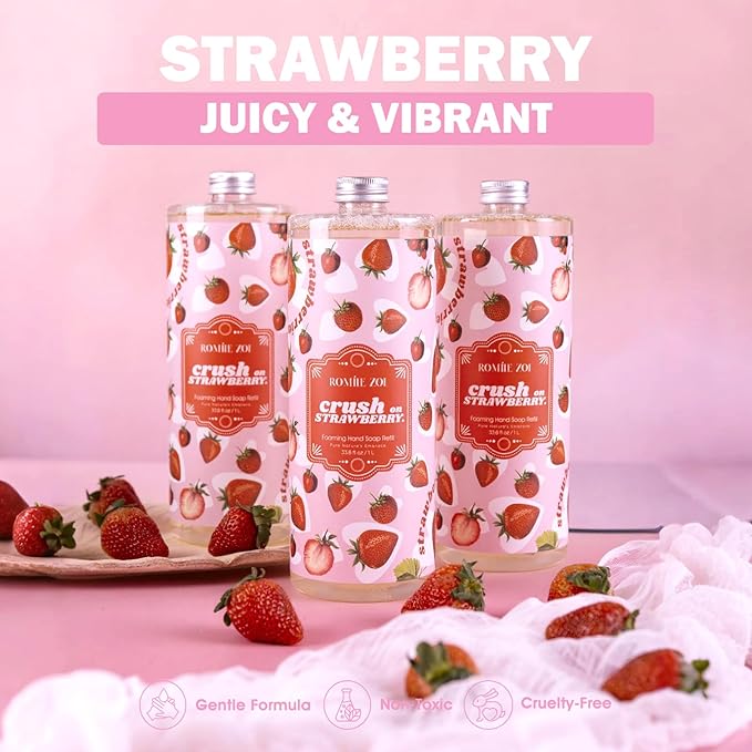 ROMIIE ZOI Strawberry Foaming Hand Soap Refill Set – 3 x 33.8 Fl Oz with Refillable Dispenser, Natural and Cruelty-Free Formula, Large Family Pack for Home, Bathroom, and Luxury Gifting