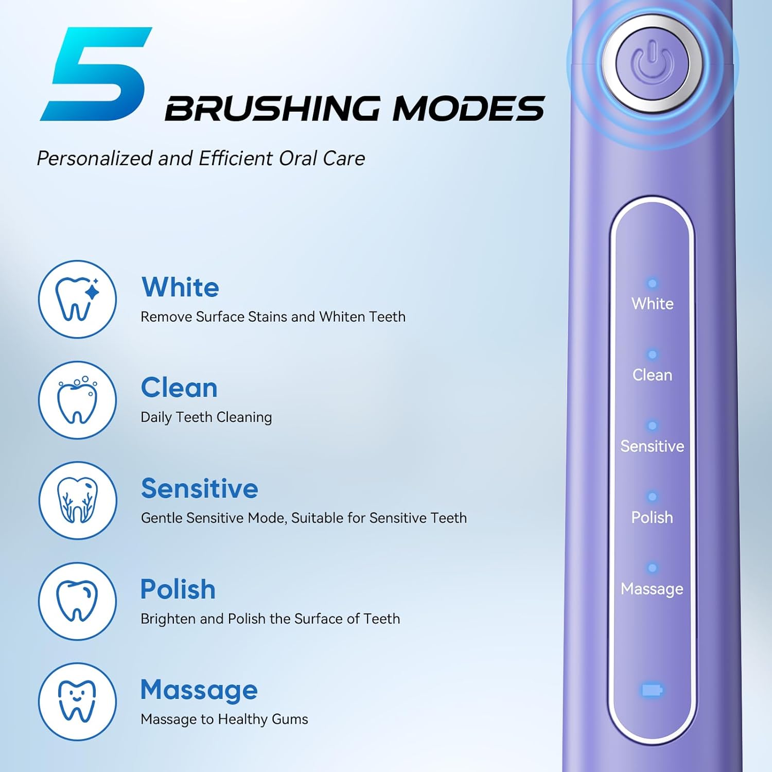 - 【5 Optional Modes for a Personalized Clean】 This sonic purple electric toothbrush features 5 customized modes—White, Clean, Soft, Polish, and Gum Care—to suit every oral care need. Whether you're targeting plaque removal, gum sensitivity, or need an electric toothbrush for braces, this brush adapts to your unique dental condition.