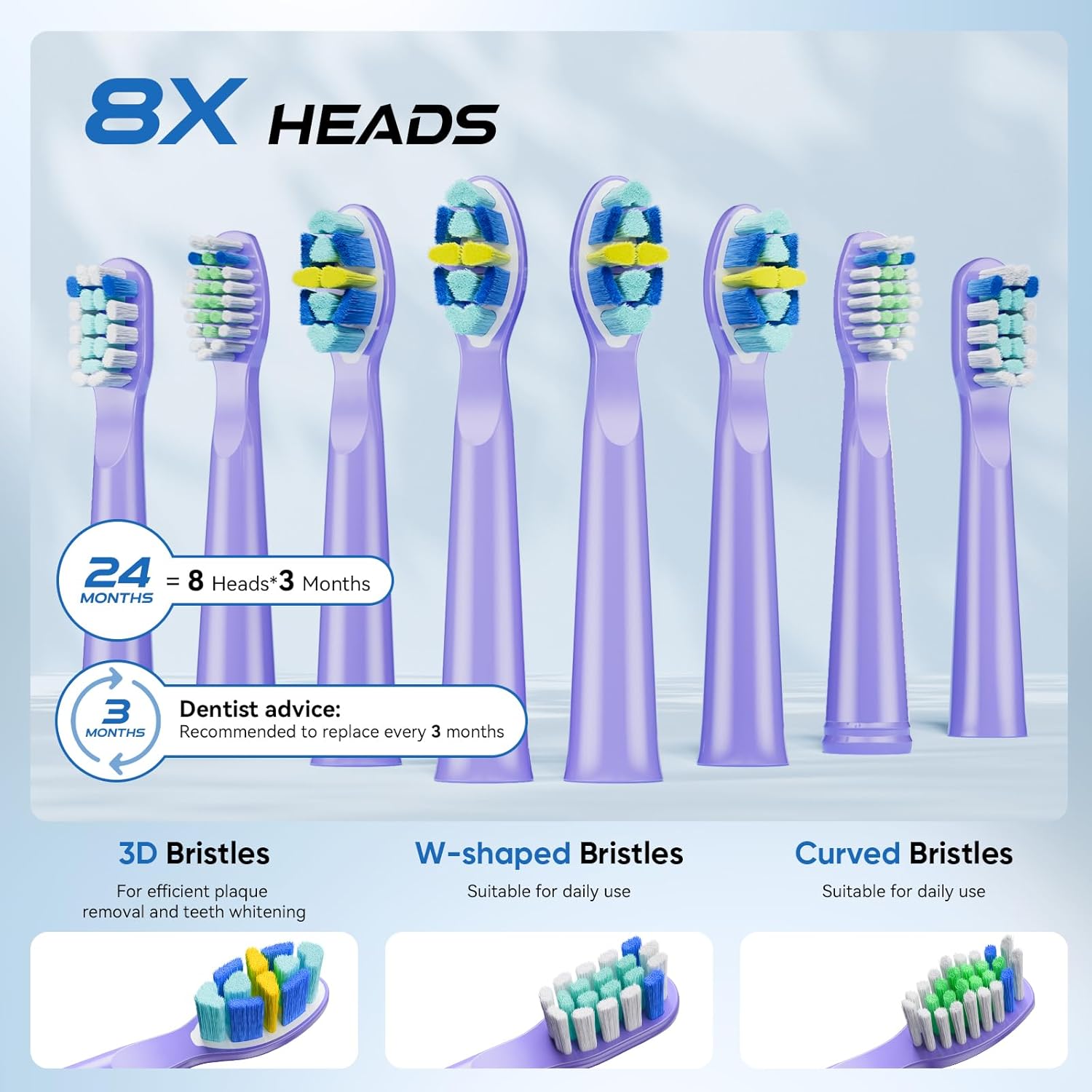 - 【8 DuPont Brush Heads Last Up to 2 Years】 Comes with 8 soft W-shaped DuPont Bristle repalcement brush heads that are gentle yet effective—designed for sensitive gums, stain removal, and deep cleaning. One set supports up to 24 months of use, making it a cost-effective choice compared to most sonic toothbrushes.