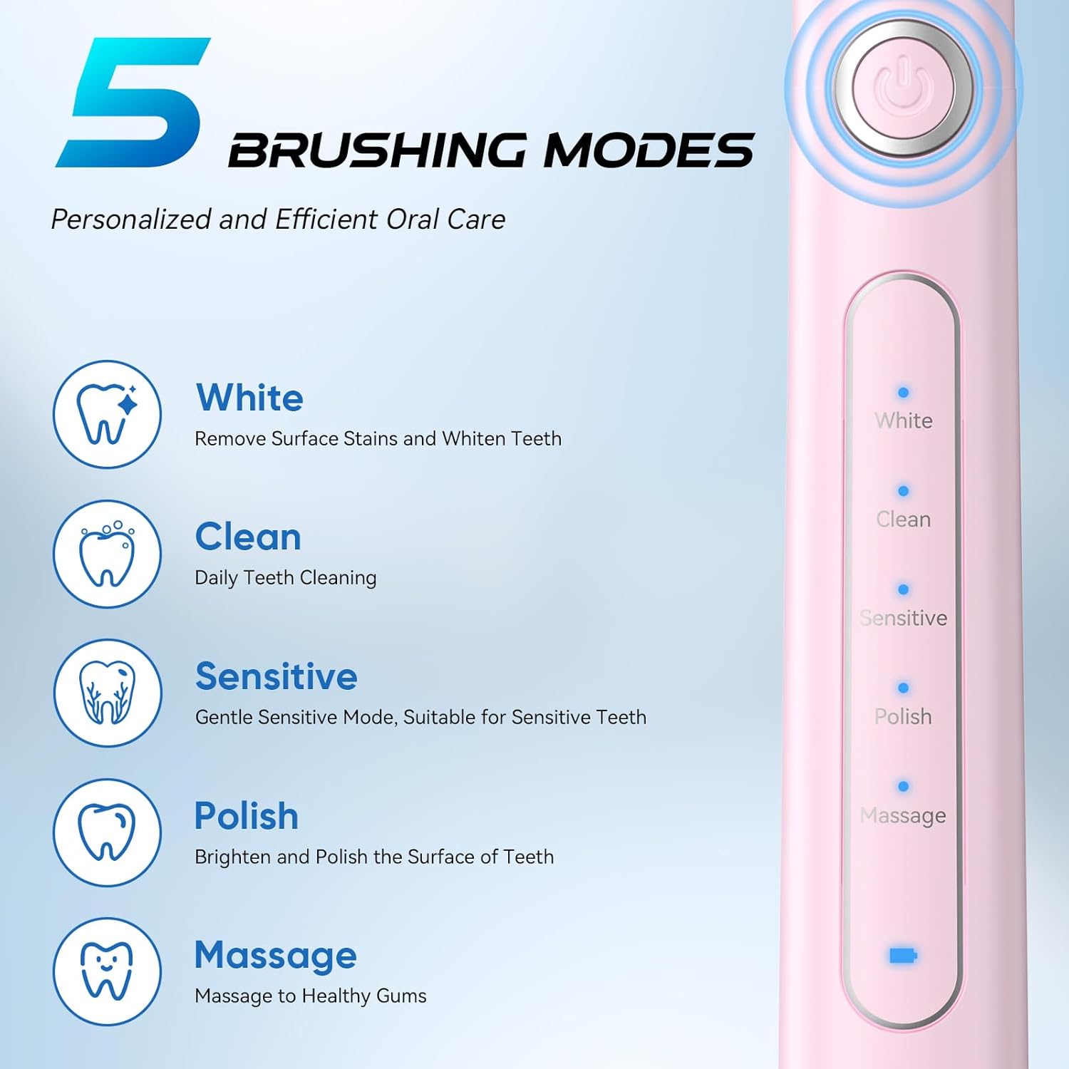 - 【5 Optional Modes for a Personalized Clean】 This sonic pink electric toothbrush features 5 customized modes—White, Clean, Soft, Polish, and Gum Care—to suit every oral care need. Whether you're targeting plaque removal, gum sensitivity, or need an electric toothbrush for braces, this brush adapts to your unique dental condition.