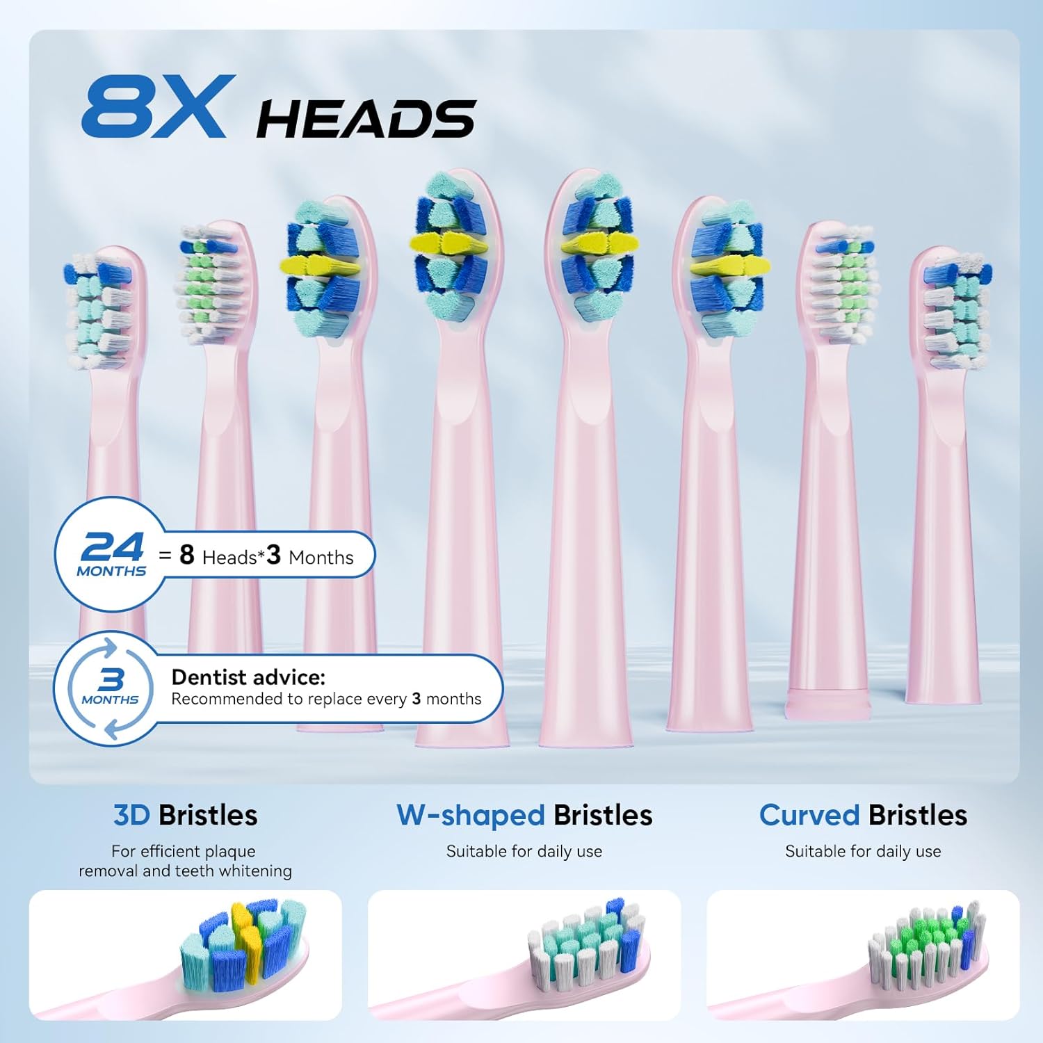 - 【8 DuPont Brush Heads Last Up to 2 Years】 Comes with 8 soft W-shaped DuPont Bristle repalcement brush heads that are gentle yet effective—designed for sensitive gums, stain removal, and deep cleaning. One set supports up to 24 months of use, making it a cost-effective choice compared to most sonic toothbrushes.