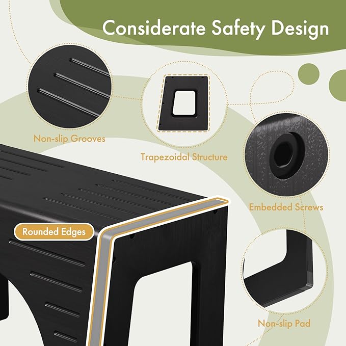 - Thoughtful Safety Design: The toddler step stool comes with 4 long non-slip pads and non-slip stripes to ensure your child's safety. Rounded edges and recessed screw holes prevent collisions, trapezoidal structure design enhances stability, providing a secure platform for your child to stand independently.