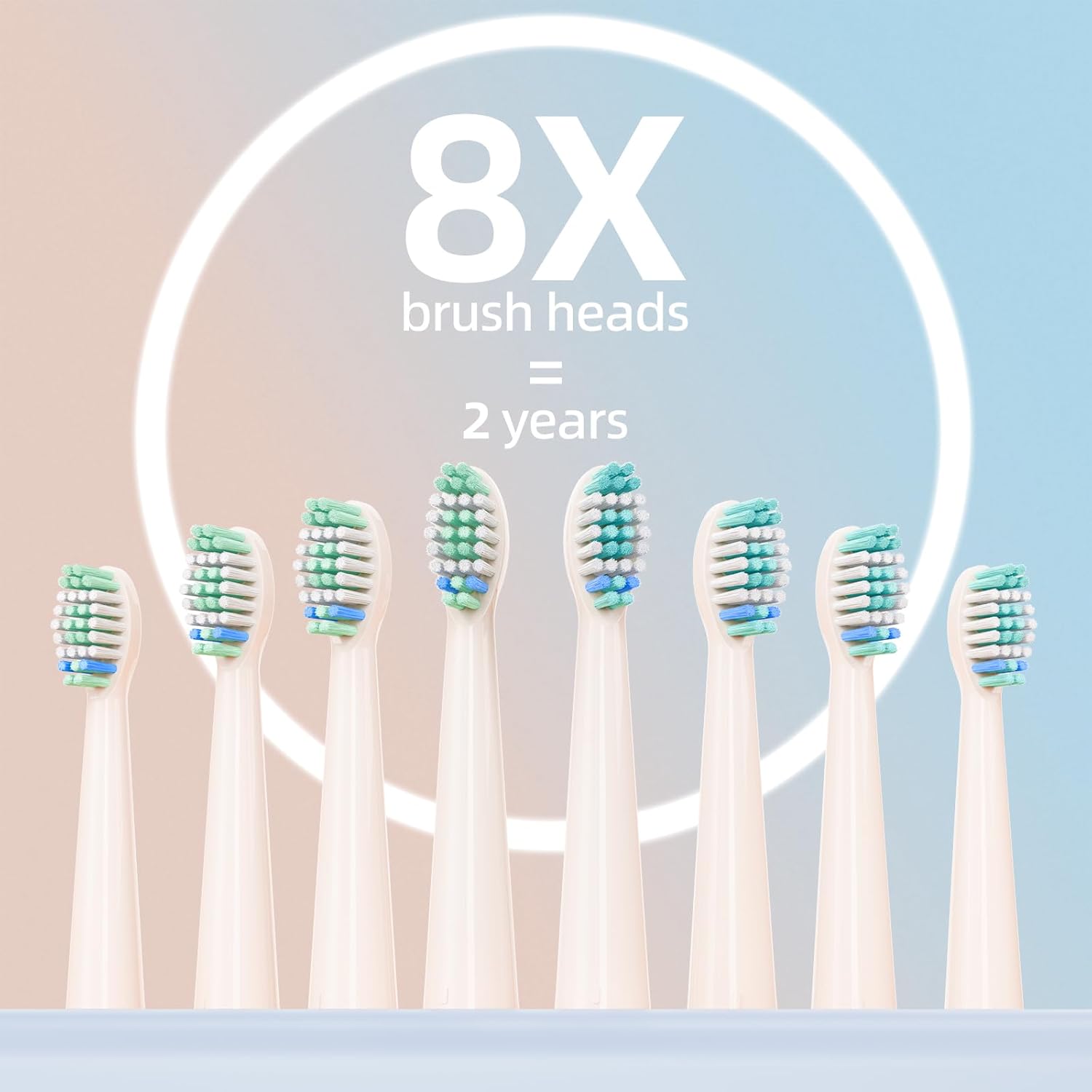 - 【8 DuPont Brush Heads Last Up to 2 Years】 Comes with 8 soft W-shaped DuPont brush heads that are gentle yet effective—designed for sensitive gums, stain removal, and deep cleaning. One set supports up to 24 months of use, making it a cost-effective choice compared to most sonic toothbrushes.