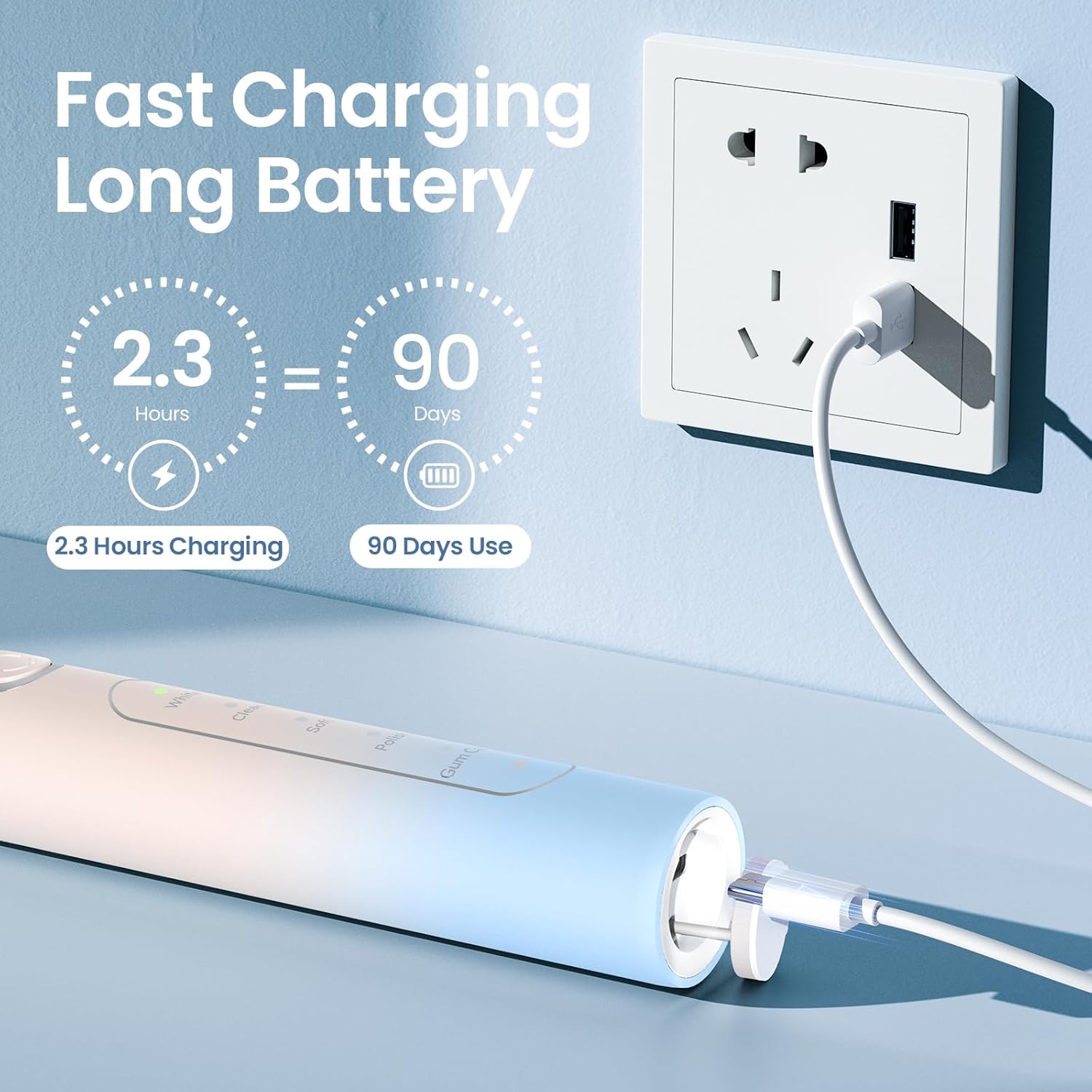- 【Fast Type-C Charging & Ergonomic Design】 Enjoy fast USB-C charging—fully charges in just 2.3 hours and lasts up to 90 days (2 uses/day). Lightweight and ergonomically designed with a non-slip grip, it's the ideal travel electric toothbrush for home, business trips, or vacation.