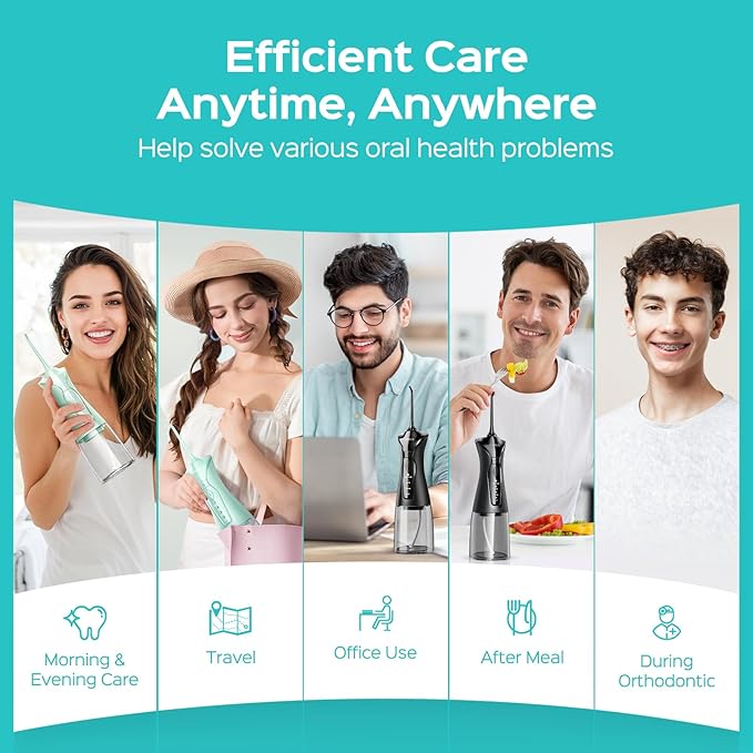 - Fast Charging & Extended Battery Life: Our portable travel water dental flosser features a high-capacity battery that lasts twice as long as many other models. The quick-charging, cordless design delivers up to a month of use on a single charge. Compact and lightweight, it fits easily into backpacks or suitcases—perfect for offices, dorm rooms, or travel. Designed to help you maintain a fresh, confident smile anytime, anywhere
