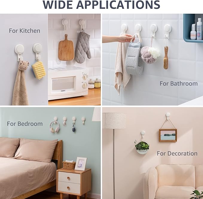 - Widely applicable: These creative wall hooks provide the best organization solution for your bathroom, kitchen, basement, window, mirror and more place for hanging shower towels, sponges, bath brush, coats, bags, hats, keys, kitchenware, bath accessories etc. Hang whatever and wherever you want