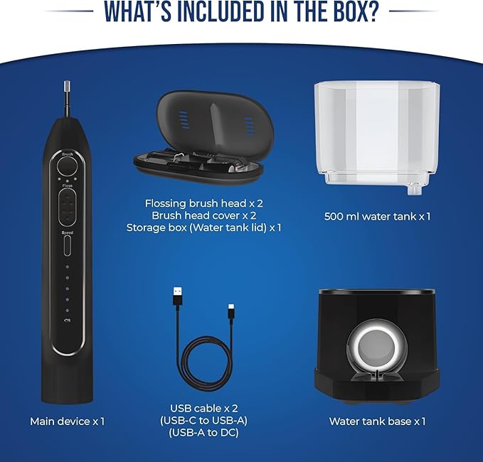 - WHAT'S IN THE BOX -1x Device Body, 2x Flossing Toothbrush Head, 2x Brush Head covers, Storage Box, 500ml Water Tank, Water Tank Base, 2X USB Cable, User Manual