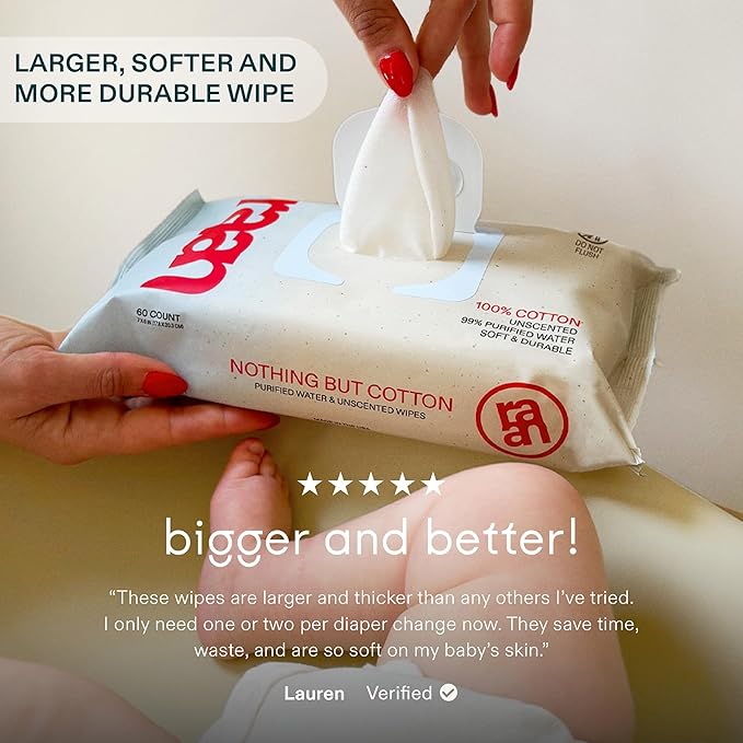 - Parents Choose Raan Cotton Baby Wipes:100% USA grown cotton wipe with 99% purified water and 5 clean ingredients including organic aloe. Grown through regenerative farming, our cotton preserves its naturally soothing waxes and oils, giving each wipe exceptional softness for sensitive skin while still cleaning effectively.