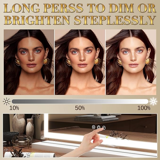 - 【3 Light Modes & Smart Dimming】 Switch between warm light, natural daylight, and cool white light to match any scenario—morning routines, evening events, or studio-style makeup. Adjust brightness with a simple touch to achieve flawless lighting for every look. Whether you're contouring, applying eyeliner, or checking skincare, the dimmable feature ensures optimal visibility.