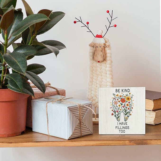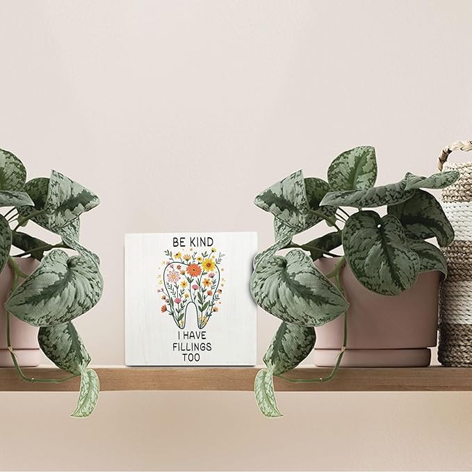 Floral Tooth Wooden Signs,Dental Decor Wooden Box Sign,Funny Dental Hygienist Decor For Home Desk Tabletop Shelf Decoration 5x5 Inches