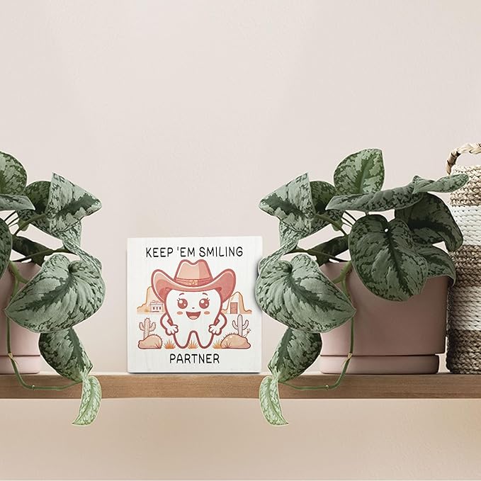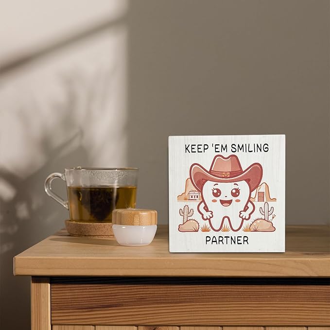 Western Vintage Dental Hygienist Wooden Signs,Wild West Tooth Wooden Box Sign,Cowgirl Dentist Dental Decor For Home Desk Tabletop Shelf Decoration 5x5 Inches