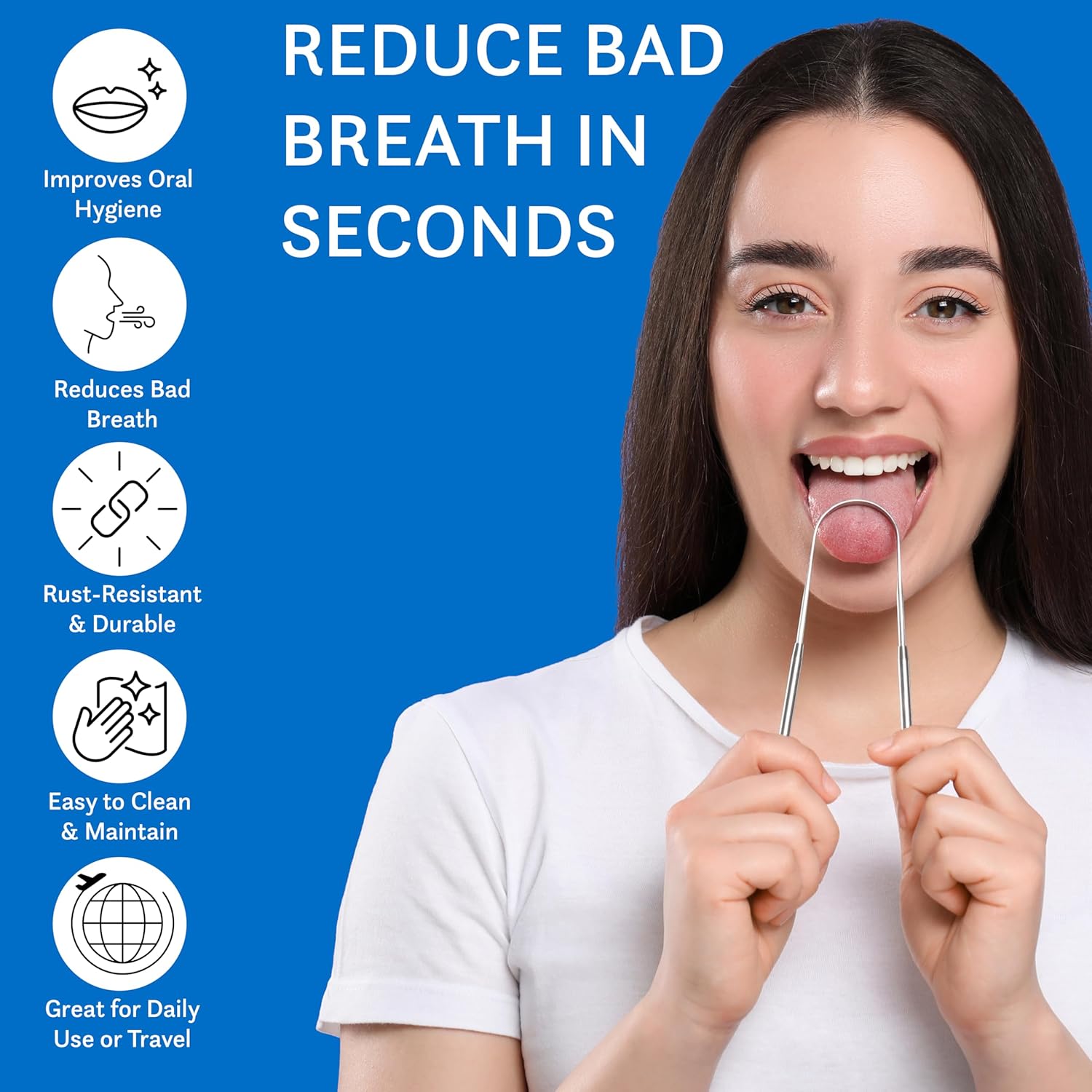 - 🛠 DUAL-ACTION SCRAPER STYLES: Includes two unique stainless steel scraper heads – one U-shaped for broad coverage, and one precision edge for targeted cleaning. Designed to remove buildup from all areas of the tongue surface, boosting oral freshness and reducing odor-causing bacteria.