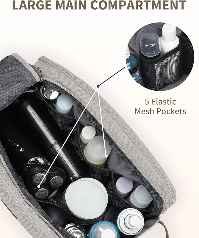 - 【Stay Organized on the Go】: Available in two sizes, the Medium (9.4''L x 5.9''H x 5.5''W ) and Large (11.5''L x 6.3''H x 6.5''W ) toiletry bags fit all your travel essentials. The Medium size is perfect for individual use, while the Large size offers ample space to hold toiletries for the whole family. The mesh pockets keep bottles upright, and two elastic loops in the lid help secure items like toothbrushes or razors.