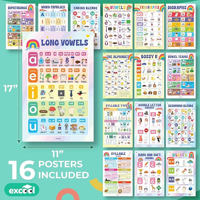 EXCOOL CLUB 16 Pcs Sound Wall Classroom Phonics Posters - Syllable Types Posters For Classroom Decor, Long And Short Vowel Chart Digraphs And Blends Poster For Kids Toddler Learning (11x17 Inch)