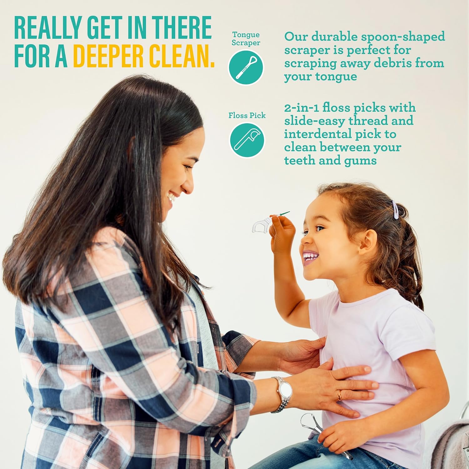 - SCRAPE & FLOSS FOR A CLEANER MOUTH: After brushing, use the Spoon-Shaped Tongue Scraper to remove buildup & freshen your breath. Then, make flossing easy with 2-in-1 Floss Picks—perfect for removing stuck food particles and ensuring a deep clean.