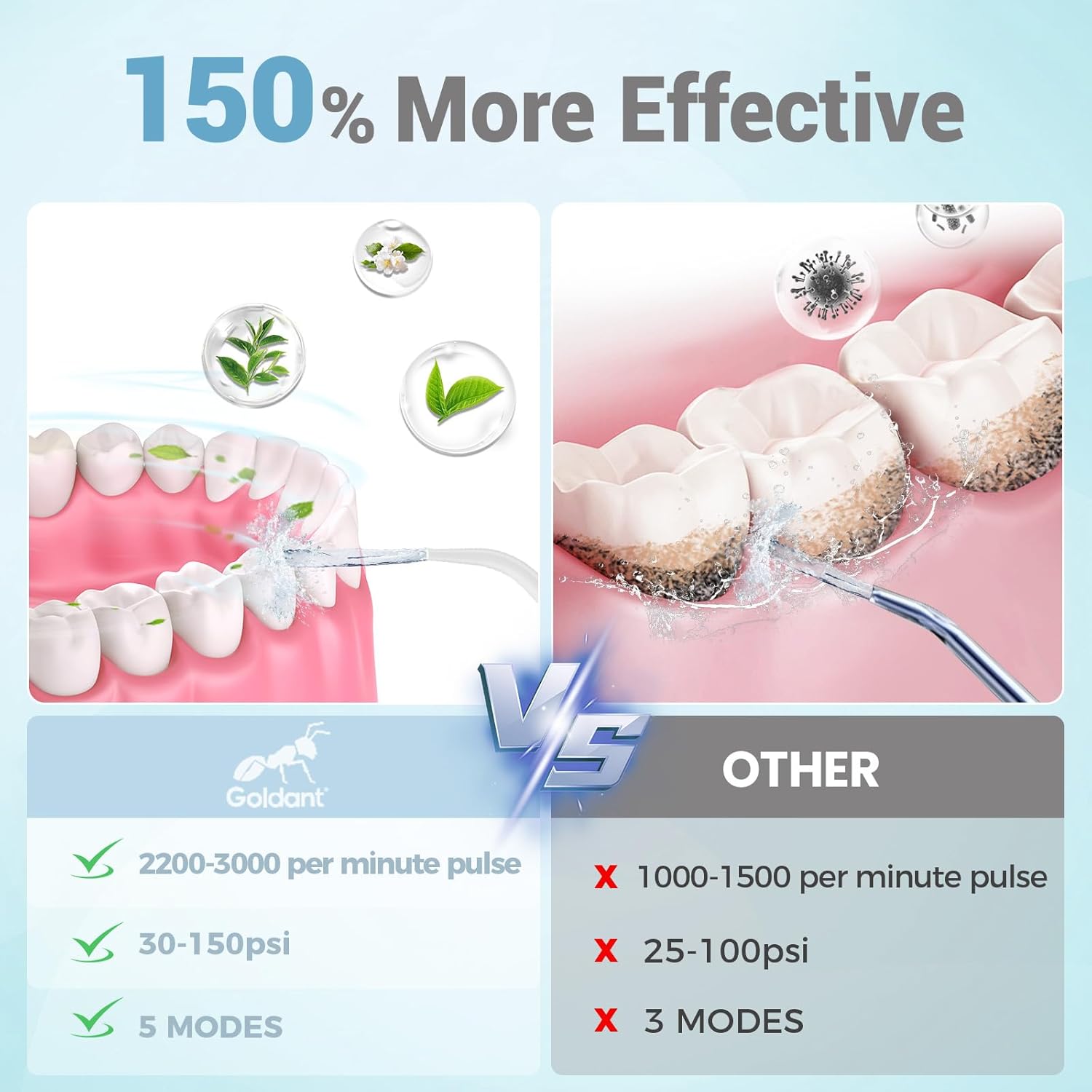 - 【5 Modes】Goldant cordless water flosser, power dental flossers 5 modes (Strong/Normal/Soft/Pulse/Child) The irrigador dental provides a strong water flow of 2200-3000 per minute pulse, 30-150PSI adjustable strong water pressure, effectively removes dental plaque, thoroughly removes food debris and stains between teeth and below the gum line, and meets various dental cleaning needs. from deep cleaning to gentle use.5 replaceable nozzles included for customized care; Please start with the child mode if you are a beginner.