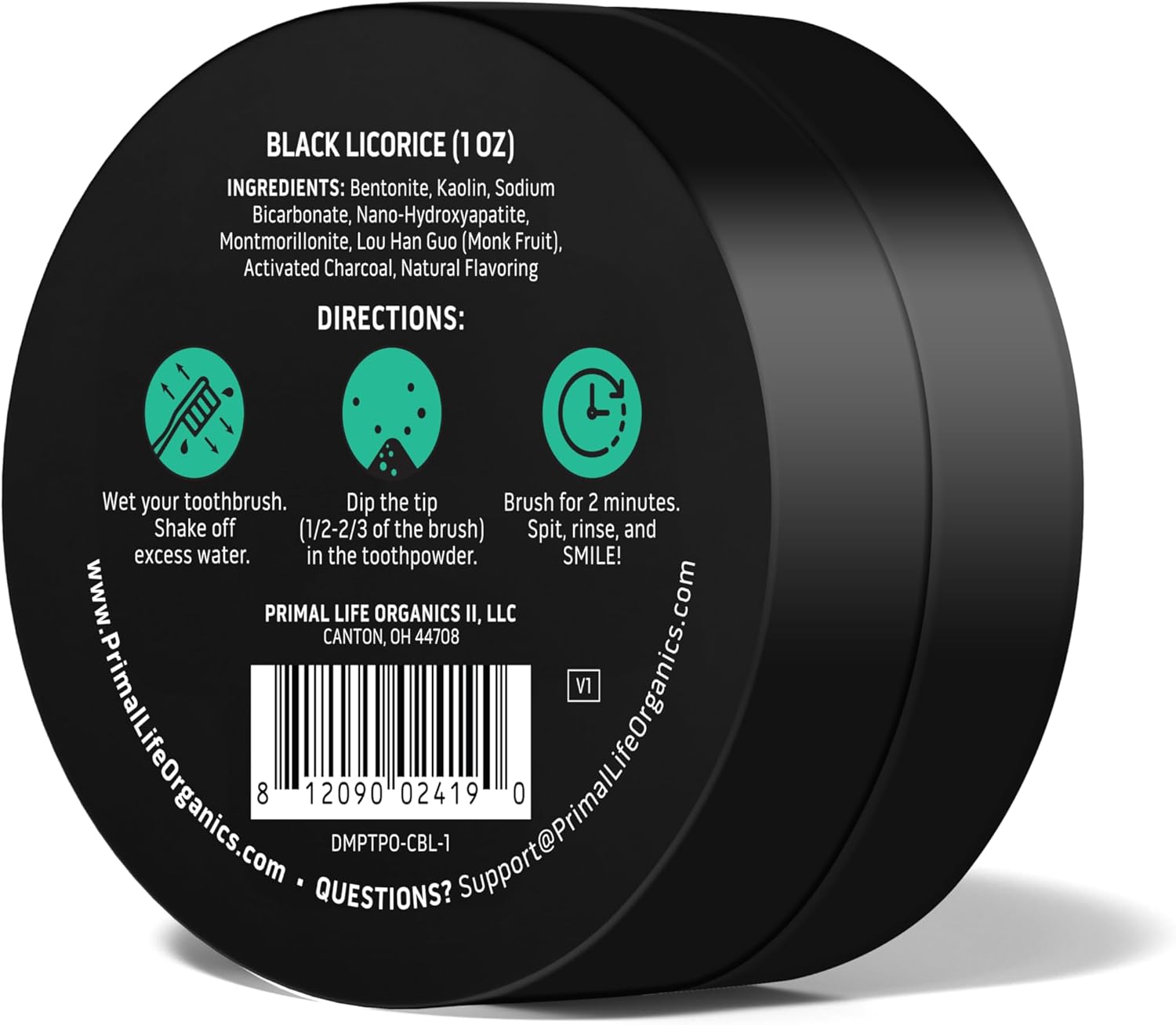 Primal Life Organics - Dirty Mouth Toothpowder, Activated Charcoal Tooth Cleaning Powder, Essential Oils Natural Kaolin Bentonite Clay, 200+ Brushings, Organic Vegan (Charcoal Black Licorice, 1 oz)