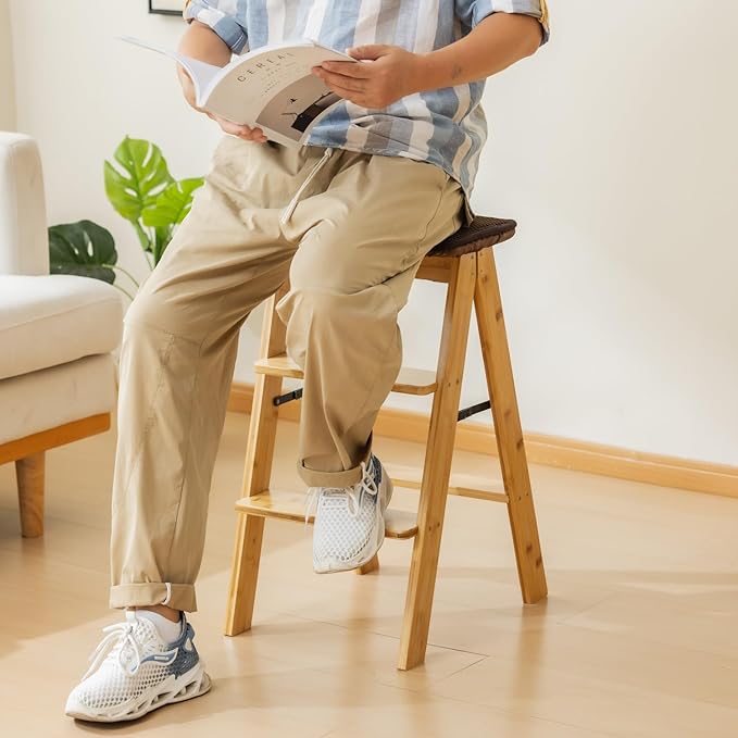 - Dual-Purpose Bamboo Design: This charming bamboo ladder step stool seamlessly combines sturdy functionality with rustic farmhouse appeal. Use it as a safe step stool or display your favorite plants, books, and decorative accents on its versatile tiers.