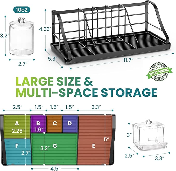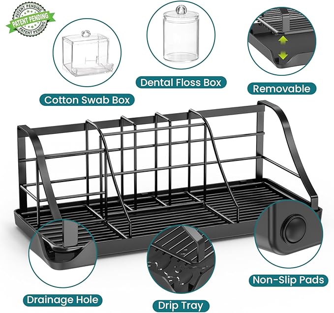 - 【Fits Your Space Perfectly】: Premium matte black toothbrush holder matches any style of bathroom countertop. The size of this bathroom toothbrush holder is 11.7"L x 5.3"W x4.2"H(29.7X13.4X10.6 cm), Q tip holder size:3.5"L x2.7"W x3"H and 2.7"L x 3.2"H(10 oz)