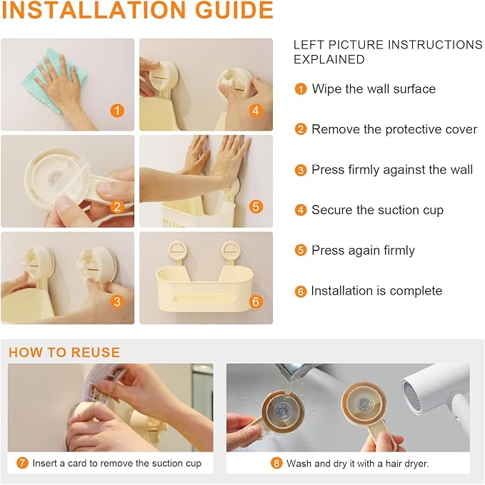 - 【EASY INSTALLATION TIPS】 To ensure a strong, lasting hold: ✅ Best On: Glass, mirror, ceramic tile, polished metal, stainless steel. Always ensure the surface is clean and dry for optimal suction. ❌ Avoid: Grout lines, wallpaper, painted walls, raw wood, or porous stone , as these surfaces can allow air to seep in and weaken the suction hold.