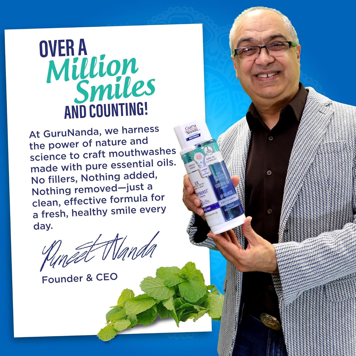 - WHITENING & ORAL CARE INNOVATION: GuruNanda Whitening Mouthwash uses a fluoride-free, dual-chamber formula. One chamber has hydrogen peroxide, while the other holds 7 essential oils, baking soda, and xylitol, creating a pH-balanced solution for a brighter smile.