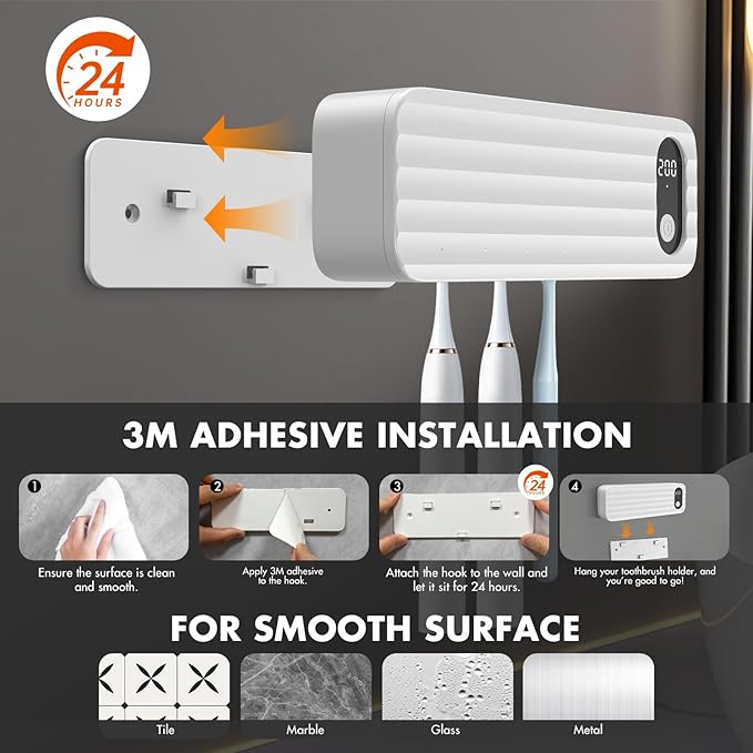- EASY, NO-DRILL INSTRALLATION: This toothbrush holder l unit is designed for simple installation without the need for drilling or a power outlet. It includes a strong adhesive that securely attaches to smooth, flat surfaces such as tiles, mirrors, or stainless steel. For rough or painted walls, screw installation may be required.