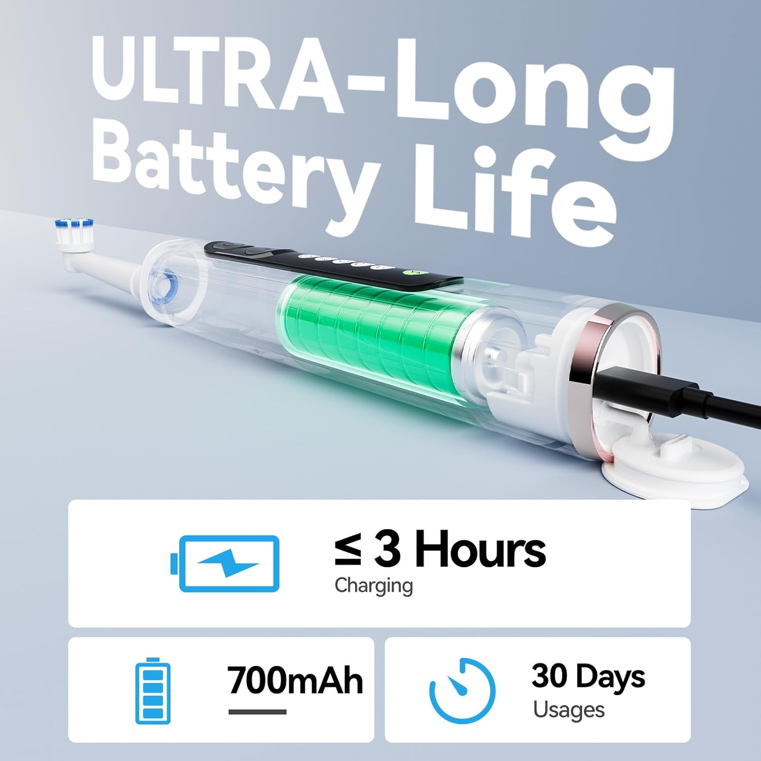 - Typec Fast Charging: Only about three hours of charging is required for 30 days of use. The rechargeable toothbrush with a Typec charging port ensures convenient charging even when traveling