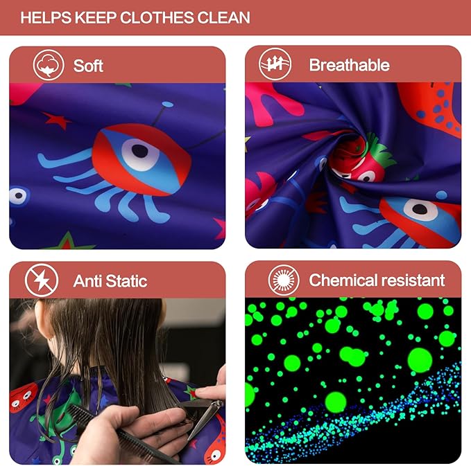 - 【PERFECT HAIRCUT CAPE FOR KIDS】- Protect kids from hair and chemicals with our barber capes; This hairdressers cape Allows the hair to slide right off and prevents trimmings from sticking or clinging to the clothes