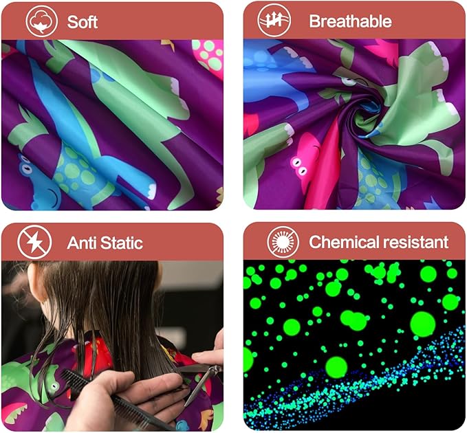 - 【FULL COVERAGE】- This kids hair cutting cape measures W39” x L55”. It ensures full coverage and protection of clothes during haircuts,Soft polyester, lightweight and Anti-static, hair won’t stick to material.