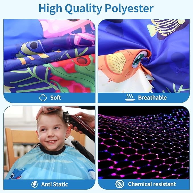 - 【PERFECT HAIRCUT CAPE FOR KIDS】- Protect kids from hair and chemicals with our barber capes; This hairdressers cape Allows the hair to slide right off and prevents trimmings from sticking or clinging to the clothes