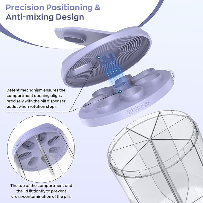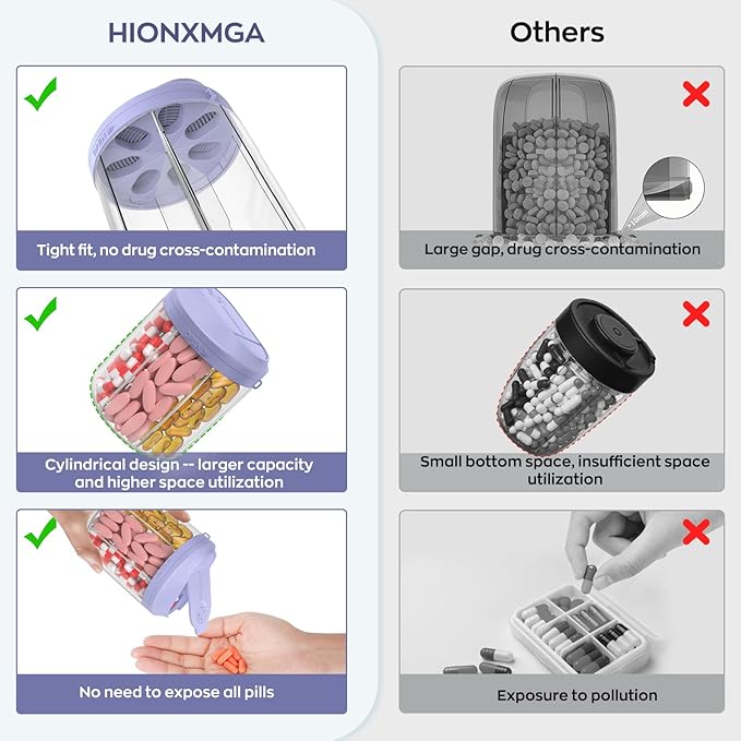 - Easy to use: Hionxmga pill storage box has a flexibly rotating lid and a wide opening, and has exclusive detent mechanism design ensures precise alignment of the compartment opening with the pill dispenser outlet after the rotation is completed. These advantages not only make the loading and taking of pills more convenient and the distribution more accurate, but also avoid the medicine from contacting external contamination. Ensure that each time you take the medicine is efficient and hygienic.