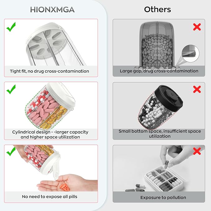 - Easy to use: Hionxmga pill storage box has a flexibly rotating lid and a wide opening, and has exclusive detent mechanism design ensures precise alignment of the compartment opening with the pill dispenser outlet after the rotation is completed. These advantages not only make the loading and taking of pills more convenient and the distribution more accurate, but also avoid the medicine from contacting external contamination. Ensure that each time you take the medicine is efficient and hygienic.