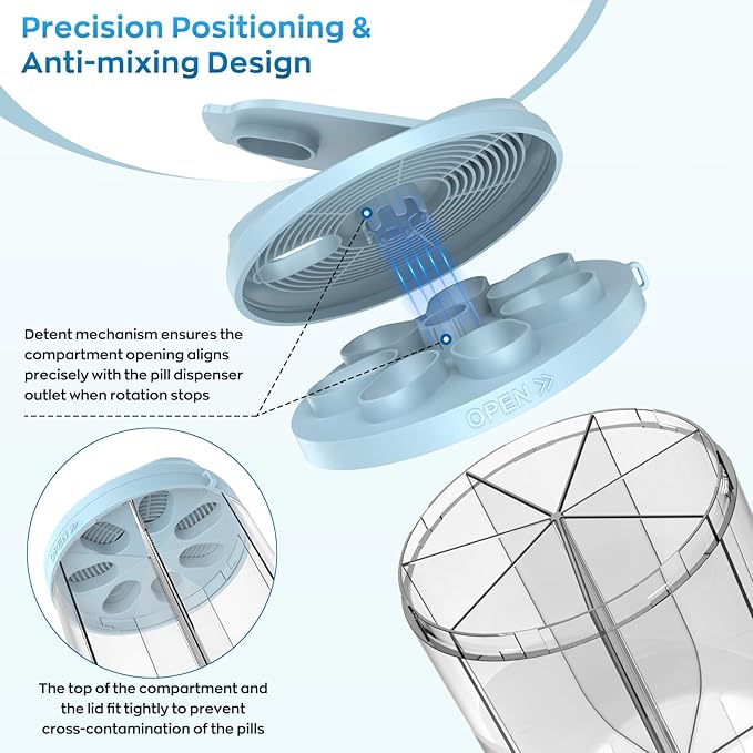 - Easy to use: Hionxmga pill storage box has a flexibly rotating lid and a wide opening, and has exclusive detent mechanism design ensures precise alignment of the compartment opening with the pill dispenser outlet after the rotation is completed. These advantages not only make the loading and taking of pills more convenient and the distribution more accurate, but also avoid the medicine from contacting external contamination. Ensure that each time you take the medicine is efficient and hygienic.