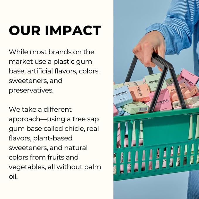 - ORGANICALLY SOURCED POWDERS: Each piece of Refresh Gum is made with natural chicle gum base and infused with organic powders like mint, raspberry, and peach offering a natural flavor experience. No artificial flavors or colors—just vibrant, plant-based ingredients to satisfy your craving.